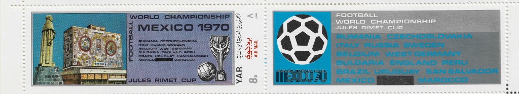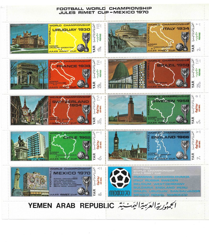 מדינות רבות בעולם נוהגות להנפיק בולים לכבוד ארועי ספורט חשובים, והמונדיאל הוא בהחלט אחד מארועי הספורט החשובים בעולם. בין המדינות שהנפיקו בולים לכבוד המונדיאל היתה גם צפון תימן, ששמה הרשמי היה הרפובליקה הערבית של תימן (להבדיל מדרום תימן ששמה הרשמי היה הרפובליקה העממית של תימן). צפון תימן הנפיקה גליון חריג עם עשרה בולים. שמונה בולים הוקדשו לשמונת הטורנירים הקודמים (מונדאיל 1970 היה המונדיאל התשיעי בהסטוריה) ושני בולים לטורניר הצפוי ביוני 1970 במקסיקו. בשני הבולים הללו נכתבו רשימת המדינות שעלו לטורניר היוקרתי. זמן קצר לאחר הדפסתם, הבחין מישהו בתקלה. בין המדינות שעלו היתה כאמור גם מדינת ישראל, ושם השיקוץ הזה הופיע באותם שני בולים. הבולים הוחזרו למכבש הדפוס, ועל שמה של ישראל הודפס פס שחור שהסתיר את הפאדיחה הקטנה של צפון תימן (פאדיחה לשיטתם, לא לשיטתי). רוב הבולים "תוקנו" כך ששמה של ישראל הוסתר, אך מיעוטם של הבולים דלף ללא הפס שהסתיר את ישראל. לשתי הגרסאות של הגליון, יש מקום של כבוד אצלי באוסף.