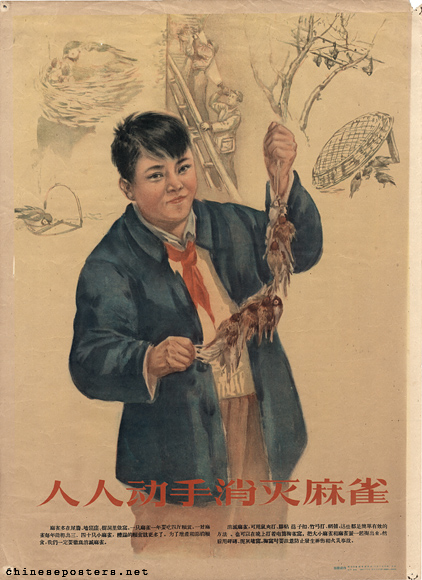 השנה היא 1958. בסין שולט היו"ר מאו, ללא כל מיצרים. מאו מעוניין לשפר את התברואה ולהגדיל את התבואה ולכן מורה לצאת למאבק עממי נגד ארבעה מזיקים: זבובים, יתושים, חולדות ו… דרורים (!). רגע, אפשר להבין את המאבק בשלושת הראשונים, אבל דרורים, מה הנזק שהציפורים הקטנות הללו יכולות לעולל? הדרורים ניזונים, בין היתר מסוגים שונים של גרעינים, ומאו החליט שהם אוכלות יותר מדי גרעינים על חשבון בני עמו הרעבים. סין של מאו היתה אומה מגוייסת לחלוטין. כאשר מאו החליט על מאבק כלשהו, ולאו דווקא מאבק כנגד סוכנים קפיטליסטים או בני אנוש שהוא לא אהב, האומה כולה התגייסה למאבק. כך למשל כאשר הוחלט שצריך להיאבק נגד לכלוך, גויסו הסינים לנקות את הרחובות ואת הבתים. בכל שכונה מונו מפקחים שתפקידם היה להכנס לבתים ולוודא שגם בבית אין אבק או לכלוך. הם לא היו מסתפקים במבט מהיר, הם היו מעבירים אצבעות בחלק התחתון של השולחן או פותחים מגירות וכד'. נחזור לקמפיין ארבעת המזיקים. כל סיני היה צריך להביא כמה שיותר מזיקים מתים. מי שהביא הרבה דרורים, זכה לתהילה, אך מי שהביא מעט דרורים ננזף. לא קל ללכוד את הדרורים, מן הסתם כאשר אדם מתקרב אליהם הם עפים, ולמרבית הסינים לא היה נשק קל. הפתרון היה שימוש ברוגטקות, אבל גם זה לא עזר. הסינים עברו לטקטיקה של תיפוף על סירים כדי להפחיד את הדרורים, לגרום להם לעוף עד לאפיסת כוחות שאז הם פשוט היו נופלים מהשמים, פשוטו כמשמעו. זה נשמע בלתי אפשרי, אבל הדרורים אינם צפורים נודדות, והם מסוגלים לעוף זמן קצר יחסית, ואם לא מאפשרים להם לנחות, הם יגיעו לאפיסת כוחות בתוך פחות משעה. מאות מליוני דרורים הושמדו בצורה הזאת. הרצון להשמיד עוד ועוד דרורים קיבל בטוי מוזר כאשר שגרירויות ונציגויות דיפלומטיות התבקשו לאפשר לסינים לצוד את הדרורים שנחתו בחצריהם. אלו סירבו לעשות כך, והסינים פשוט עמדו ליד הגדר והפחידו את הדרורים על ידי תיפוף על סירים. המבצע של הסינים הצליח, והדרורים נעלמו משמי סין. אבל מהר מאוד החלו הסינים להתגעגע לדרורים. הדרורים אמנם אוכלים גרעינים, אבל הם גם אוכלים חרקים. כעת, לאחר שנעלמו הדרורים, החלו החרקים להתרבות, והם, כך התברר, אוכלים יותר גרעינים מהדרורים. בשנים שלאחר העלמות הדרורים החל רעב כבד בסין. הערכות מינימליסטיות מדברות על 15 מליון סינים שגוועו ברעב. חשוב לציין שהיו סיבות נוספות לרעב, שנת בצורת וניהול איום של הגידולים החקלאיים, אך התפשטות חרקים בשדות היתה אחת הסיבות המשמעותיות לחוסר היכולת של הסינים לגדל מספיק תבואה על מנת להאכיל את עצמם. לאחר שנתיים של קמפיין, שוכנע מאו לשנות את ההגדרה של ארבעת המזיקים, ואת הדרורים החליפו הפשפשים, אך היה זה מעט מדי ומאוחר מדי. בשנות השישים החלה לייבא דרורים מברית המועצות ומקנדה, על מנת לשקם את אוכלוסיית הדרורים ולתקן את הנזק האקולוגי שהיא עצמה גרמה לו. בראשית המאה העשרים ואחת, אף הושק בסין קמפיין להגנה על הדרורים. לא מצאתי נתונים על כמות הדרורים בסין היום, אבל בפורומים באנגלית של צפרים, נשאלה השאלה וסינים רבים ענו שהם רואים לא מעט דרורים ביום יום, אך לא יכלו לתת נתונים סטטיסטים.