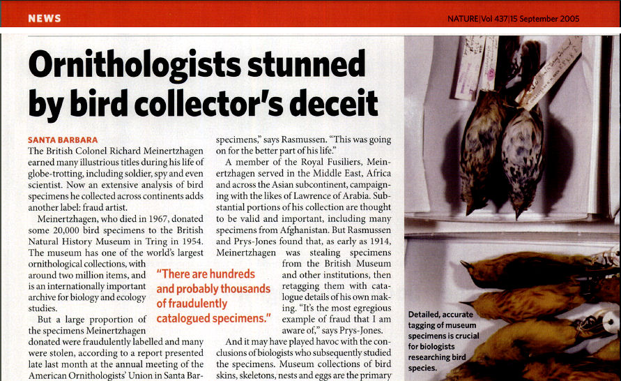 מי היה ריצ'ארד מיינרצאגן? אם מסתמכים על היומן והפרסומים שלו, הרי שמדובר איש מודיעין מבריק, צפר בעל שם עולמי שאף פרסם ספרי יסוד באוֹרְנִיתוֹלוֹגְיָה (חקר העופות), לוחם ללא חת, אדם שקיבל עיטורים ומדליות על הישגיו. איש מרשים ביותר, ללא שום עוררין. בשנות התשעים, למעלה מעשרים שנה לאחר מותו, החלו חוקרים שונים לפקפק בהישגיו. על האיש המרתק הזה, שהיום השאלה היא יותר כמה מפעולותיו והישגיו הם אותנטים וכמה לא, בפוסט הזה.